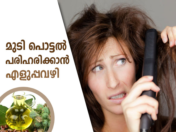 ആവണക്കെണ്ണയിലെ റിച്ചിനോലിക് ആസിഡ് നിങ്ങളുടെ തലയോട്ടിയിലേക്ക് രക്തചംക്രമണം വര്ദ്ധിപ്പിക്കാന് സഹായിക്കുന്നു. ഇത് മുടിയെ പോഷിപ്പിക്കുകയും ശക്തിപ്പെടുത്തുകയും മുടി പൊട്ടുന്നത് തടയുകയും ചെയ്യുന്നു. 1 ടേബിള് സ്പൂണ് ആവണക്കെണ്ണ, 1 ടേബിള് സ്പൂണ് വെളിച്ചെണ്ണ അല്ലെങ്കില് ഒലിവ് ഓയില് എന്നിവയെടുക്കുക. ഇത് മിക്സ് ചെയ്ത് തലയോട്ടിയിലും മുടിയിലും പുരട്ടി മസാജ് ചെയ്യുക. 1-2 മണിക്കൂര് കഴിഞ്ഞ് ഒരു മിതമായ ക്ലെന്സര് ഉപയോഗിച്ച് മുടി കഴുകുക. ആഴ്ചയില് 1-2 തവണ ഇങ്ങനെ ചെയ്യുക.