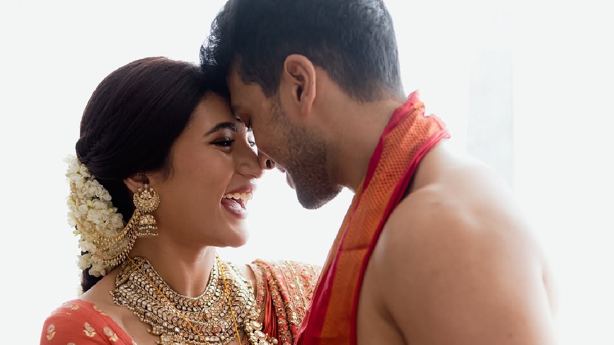 സാരിയും ആഭരണവും ഹെവി ആയതിനാല് തന്നെ, ഹെയര് സ്റ്റൈല് ഇതിനു ചേരുന്ന വിധത്തിലാണ് സെറ്റ് ചെയ്തിരിക്കുന്നത്. അയഞ്ഞ രീതിയില് മുടി മെടഞ്ഞ്, അതില് മുല്ലപ്പൂ മനോഹരമായി ചേര്ത്തുവെച്ചിരിക്കുന്നു. ഹെയര് സ്റ്റൈല് മാത്രമല്ല, മേയ്ക്കപ്പിലും പ്രത്യേകതകളുണ്ട്. തരുണിയുടെ മുഖത്തിന്റെ ഫീച്ചേഴ്സ് എടുത്ത് കാണിക്കുന്നതും സാരിയ്ക്ക് ചേരുന്നതുമായ മേയ്ക്കപ്പാണ് ഉള്ളത്. സാരിയുടെ നിറം ബ്രൈറ്റ് ആയതിനാല് തന്നെ, ന്യൂഡ് ഷേയ്ഡിലുള്ള ലിപ്സ്റ്റിക്കാണ് തിരഞ്ഞെടുത്തിരിക്കുന്നത്. ഇരുവരുടെയും മനപ്പൊരുത്തം പോലെ തന്നെ, വസ്ത്രങ്ങളിലും ഒരേ ടച്ച് ക1ണ്ടുവരാന് ഇരുവരും ശ്രദ്ധിച്ചിട്ടുണ്ട്.