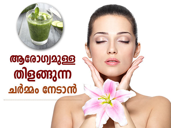 2 കപ്പ് ചീര അരിഞ്ഞത്, 1 ആപ്പിള് അരിഞ്ഞത്, ½ നാരങ്ങ, ¾ കപ്പ് വെള്ളം, കുരുമുളക് എന്നിവയാണ് ആവശ്യം. അരിഞ്ഞ ചീര നന്നായി കഴുകി അരിച്ചെടുക്കുക. ചീരയും ആപ്പിളും ബ്ലെന്ഡറില് ഇട്ട് അടിച്ചെടുത്ത്. പകുതി നാരങ്ങ പിഴിഞ്ഞ് വെള്ളവും ചേര്ത്ത് നന്നായി ഇളക്കുക. ഈ ചീര നീര് അരിച്ചെടുത്ത് ഒരു ഗ്ലാസിലേക്ക് ഒഴിക്കുക. അല്പം കുരുമുളകും ചേര്ത്ത് ഈ ജ്യൂസ് അതിരാവിലെ തന്നെ കുടിക്കുന്നത് ആരോഗ്യകരമായ ചര്മ്മം നേടാന് നിങ്ങളെ സഹായിക്കും.