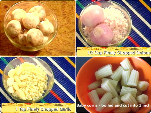 മഷ്റൂം, ബേബി കോണ് എന്നിവ കഴുകുക. മഷ്റൂം നടുവിലൂടെ രണ്ടായി മുറിയ്ക്കാം. ബേബ്ി കോണ് വട്ടത്തിലുള്ള ചെറിയ കഷ്ണങ്ങളാക്കുക. സവാള ചെറിയ സ്വയറുകളായി മുറിയ്ക്കുക.
