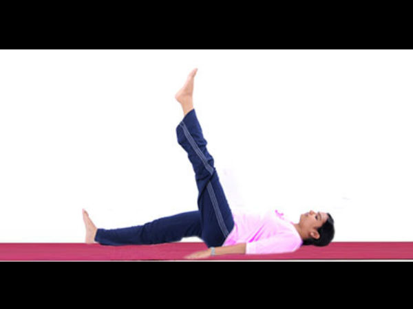 4. വായു അകത്തേക്ക് എടുത്ത് കാല് ഉയര്ത്തി ശരീരത്തിന് ലംബമായി കൊണ്ടുവരുക. കാല് പെട്ടെന്ന് ഉയര്ത്തരുത്. ഇതുമൂലം നട്ടെല്ലിന് പരുക്കേല്ക്കാം.