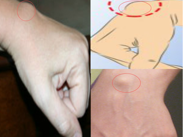 ഇവിടെ പറയുന്നത് നിങ്ങളുടെ മണിബന്ധത്തില് ഇത്തരത്തില് നീര് അല്ലെങ്കില് മുഴ പോലെ കാണുന്നതിനെപ്പറ്റിയാണ്. പ്രത്യേകിച്ച് മണിബന്ധം ഇതേ രീതിയില് മടക്കുമ്പോള്.