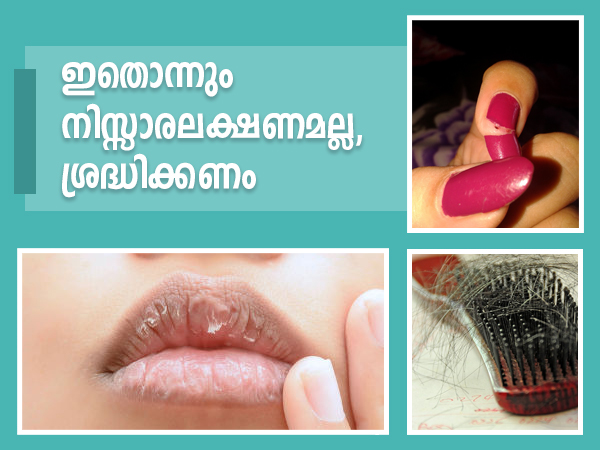 ആരോഗ്യമുള്ള നഖങ്ങള് എങ്ങനെ കാണപ്പെടുമെന്ന് നമുക്കെല്ലാവര്ക്കും അറിയാം. അവയുടെ നിറത്തിലോ ഘടനയിലോ ഉള്ള ഏത് മാറ്റവും ഭയപ്പെടുത്തുന്ന സിഗ്നലാണ്. നേര്ത്തതും ഇളം നിറമുള്ളതുമായ നഖങ്ങള് വിളര്ച്ചയുടെ അടയാളവും ശരീരത്തില് ഇരുമ്പിന്റെ അഭാവവുമാകുമ്പോള് മഞ്ഞനിറം കരള്, ഗ്യാസ്ട്രിക് ലഘുലേഖ അല്ലെങ്കില് ഫംഗസ് അണുബാധ എന്നിവയെ സൂചിപ്പിക്കുന്നു. വെളുത്ത പാടുകളും വരകളും സിങ്ക്, ചെമ്പ്, അയോഡിന് എന്നിവയുടെ അഭാവത്തെ സൂചിപ്പിക്കുന്നു, ശരീരത്തിലെ വിറ്റാമിനുകള്, കാല്സ്യം, ഇരുമ്പ്, ബീറ്റാ കരോട്ടിന് എന്നിവയുടെ അഭാവം നേരിടുമ്പോള് നഖങ്ങള് വളരെ പൊട്ടുന്നതായിത്തീരും. ഇതും വളരെയധികം ശ്രദ്ധിക്കേണ്ടതാണ്.