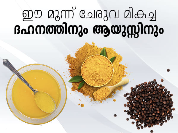 മികച്ച ദഹനത്തിന് പരിഹാരം കാണുന്നതിന് വേണ്ടി നമുക്ക് പല വിധത്തിലുള്ള കാര്യങ്ങള് ചെയ്യാവുന്നതാണ്. എന്നാല് മുകളില് പറഞ്ഞ മിശ്രിതം കഴിക്കുന്നതിലൂടെ അത് നിങ്ങള്ക്ക് ദഹന പ്രശ്നങ്ങളെ എല്ലാം ഇല്ലാതാക്കുന്നതിന് സഹായിക്കുന്നുണ്ട്. ദഹനനാളത്തിന്റെ ആരോഗ്യം മുഴുവന് ശരീരത്തിന്റെ പ്രവര്ത്തനത്തെയും ബാധിക്കും. ഇത് ദഹനക്കേടിലേക്ക് നയിക്കും. മഞ്ഞളില് ധാരാളം ആന്റി ഇന്ഫ്ശമേറ്ററി പ്രോപ്പര്ട്ടീസ് അടങ്ങിയിട്ടുണ്ട്. നെയ്യില് ആരോഗ്യകരമായ ഫാറ്റി ആസിഡുകളും കുരുമുളകിന് വിഷാംശത്തെ പുറന്തള്ളുന്നതിനുമുള്ള ഗുണങ്ങളുമുണ്ട്. ഇവയെല്ലാം ശരീരത്തില് നിന്ന് വിഷവസ്തുക്കളെ പുറന്തള്ളുന്നതിലൂടെ വയറിന്റെ ആരോഗ്യം ഉറപ്പാക്കി ദഹനപ്രശ്നങ്ങളെ പരിഹരിക്കുന്നു.