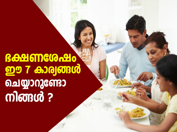 ഭക്ഷണം കഴിച്ചയുടനെ കുളിക്കരുതെന്നും കിടക്കരുതെന്നുമൊക്കെ നിങ്ങളുടെ വീട്ടിലെ മുതിര്ന്നവര് പറയുന്നത് നിങ്ങള് കേട്ടിരിക്കാം. ഇത്തരം പ്രവര്ത്തികളിലൂടെ നിങ്ങള്ക്ക് എന്തു ദോഷമാണ് ഉണ്ടാകുന്നതെന്ന് നിങ്ങള്ക്കറിയാമോ? അതെ, ആഹാരത്തിനു ശേഷം നിങ്ങള് പതിവാക്കിയ ചില ശീലങ്ങള് ചിലപ്പോള് നിങ്ങള്ക്ക് ദോഷകരമായി ഭവിക്കുന്നവയാകാം. ഉച്ചഭക്ഷണമോ അത്താഴമോ കഴിച്ചതിനുശേഷം നിങ്ങള് ചെയ്യുന്ന ചില ലളിതമായ കാര്യങ്ങളും ശീലങ്ങളും നിങ്ങളുടെടെ ആരോഗ്യത്തെ വളരെയധികം സ്വാധീനിക്കും. വര്ഷങ്ങളായി നിങ്ങള് ഇത്തരം ശീലങ്ങള് പിന്തുടരുന്നവരുമാകാം. എന്നാല് ഇനിമുതല് അത്തരം മോശം ശീലങ്ങള്ക്ക് വിടനല്കാം. ഈ ലേഖനത്തില് ആഹാരശേഷം നിങ്ങള് ഉടനെ ചെയ്യാന് പാടില്ലാത്ത ചില കാര്യങ്ങള് വായിച്ചറിയൂ.