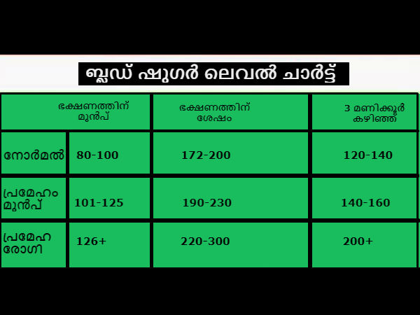 ബ്ലഡ് ഷുഗർ ലെവൽ ചാർട്ട് ഭക്ഷണത്തിന് ശേഷവും ഭക്ഷണത്തിന് മുൻപും ഇങ്ങനെയെല്ലാമാണ്. ഇത് തിരിച്ചറിയുന്നതിന് വേണ്ടി ഈ ചാർട്ട് ശ്രദ്ധിക്കാം.