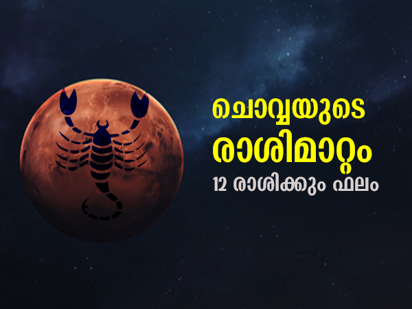 ക്രൂരമായ ഗ്രഹത്തിന്റെ വിഭാഗത്തിലാണ് ചൊവ്വയെ ഉള്പ്പെടുത്തിയിരിക്കുന്നത്. ചൊവ്വയെ പ്രകൃതിയില് അഗ്നിജ്വാലയായിട്ടാണ് കണക്കാക്കുന്നത്. ജാതകത്തില്, ചൊവ്വ ഗ്രഹം ധൈര്യം, ആത്മവിശ്വാസം, ശാരീരിക പ്രേരണകള് എന്നിവ നിയന്ത്രിക്കുന്നു. ഡിസംബര് അഞ്ചിന് ചൊവ്വാ ഗ്രഹം രാശി മാറുന്നു. തുലാം രാശിയില് നിന്ന് വൃശ്ചികം രാശിയിലേക്കായിരിക്കും ഈ സമയം ചൊവ്വയുടെ സംക്രമണം.