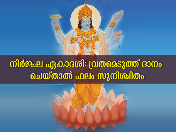 നിര്ജ്ജല ഏകാദശി എന്നത് വളരെയധികം വിശേഷപ്പെട്ടതാണ്. ഈ വര്ഷത്തെ നിര്ജ്ജല ഏകാദശി വരുന്നത് ജൂണ്10-നാണ്. ജ്യേഷ്ഠ മാസത്തിലെ ശുക്ലപക്ഷത്തിലാണ് ഈ ദിനം വരുന്നത്. നിര്ജ്ജല ഏകാദശി ദിനത്തില് നാം ആരാധിക്കുന്നത് മഹാവിഷ്ണുവിനെയാണ്. പേര് സൂചിപ്പിക്കുന്നത് പോലെ തന്നെ ഒരു തുള്ളി ജലം പോലും സേവിക്കാതെ ഭക്തിയോടെയാണ് ഈ വ്രതം അനുഷ്ഠിക്കേണ്ടത്. ഏകാദശിക്ക് വിശ്വാസികള്ക്കിടയിലുള്ള സ്ഥാനം എന്ന് പറയുന്നത് വളരെ പ്രധാനപ്പെട്ടതാണ്. ഈ ദിനത്തില് വ്രതം അനുഷ്ഠിക്കുന്നത് വിഷ്ണുവിന്റേയും ലക്ഷ്മി ദേവിയുടേയും അനുഗ്രഹം നിങ്ങള്ക്ക് ലഭിക്കുന്നതിന് പ്രധാനപ്പെട്ട സമയമാണ്.