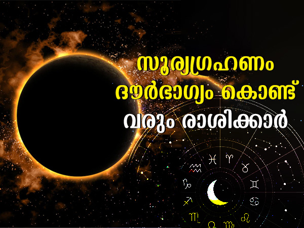 ജ്യോതിഷത്തില് സൂര്യഗ്രഹണത്തിന് പ്രത്യേക പ്രാധാന്യമുണ്ട് എന്ന് നമുക്കറിയാം. ഗ്രഹണ സമയം എന്നത് വളരെയധികം പ്രാധാന്യമുള്ള ഒന്നാണ്. ജ്യോതിഷ പ്രകാരം സൂര്യഗ്രഹണം എല്ലാ രാശികളെയും ബാധിക്കും. എന്നാല് ആ പ്രഭാവം അവസാനിക്കുമ്പോള് ചില രാശിക്കാരെ ഗ്രഹണം നെഗറ്റീവായി ബാധിക്കുന്നു. ഇവര്ക്ക് പലപ്പോഴും ഗ്രഹണ സമയം വളരെ മോശം ഫലങ്ങളും ദൗര്ഭാഗ്യങ്ങളുമാണ് ഉണ്ടാവുന്നത്. ഇത്തരത്തില് ഗ്രഹണത്തെ ഭയക്കേണ്ട ചില രാശിക്കാരുണ്ട്. അവര് ആരൊക്കെയെന്ന് നമുക്ക് നോക്കാം. ഇതിനെക്കുറിച്ച് കൂടുതല് അറിയാന് വായിക്കൂ.