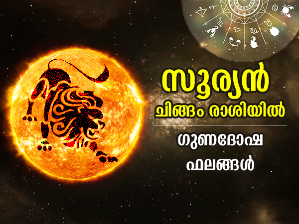 ജ്യോതിഷത്തില് ഗ്രഹങ്ങളുടെ രാജാവ് എന്നാണ് സൂര്യനെ വിളിക്കുന്നത്. സൂര്യന്റെ രാശി മാറ്റത്തെ സംക്രാന്തി എന്നും വിളിക്കുന്നു. അതിനാല് ഇത് ചിങ്ങ സംക്രാന്തിയായി അറിയപ്പെടുന്നു. ചിങ്ങത്തിലെ സൂര്യന്റെ സംക്രമണം പല രാശിക്കാര്ക്കും വളരെ ശുഭകരമായി മാറും. മറ്റു ചിലര്ക്ക് അല്പം കഷ്ടതകളും നല്കും. 12 രാശിക്കും ജീവിതത്തിലെ ഭാഗ്യനിര്ഭാഗ്യങ്ങള് അറിയാന് ലേഖനം വായിക്കൂ.