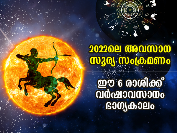 ജ്യോതിഷത്തില് സൂര്യനെ ഗ്രഹങ്ങളുടെ രാജാവ് എന്നാണ് വിശേഷിപ്പിക്കുന്നത്. ആത്മാവ്, പിതാവ്, ബഹുമാനം, ഉയര്ന്ന സര്ക്കാര് സേവനം എന്നിവയുടെ ഘടകമാണ് സൂര്യദേവന്. ഇതുമൂലം സൂര്യന്റെ ഓരോ സംക്രമണത്തിന്റെയും ഫലം എല്ലാ രാശിചിഹ്നങ്ങളിലും പ്രതിഫലിക്കും. 2022 വര്ഷത്തിലെ അവസാന സൂര്യ സംക്രമണം ഡിസംബര് മാസത്തില് നടക്കും.