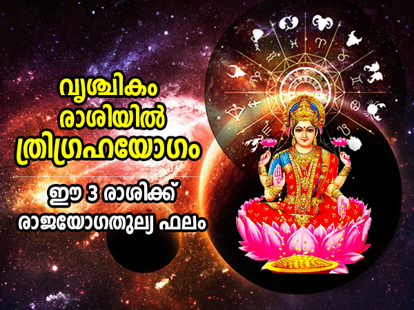 നവംബര് 11ന് ശുക്രന് വൃശ്ചികം രാശിയില് സംക്രമിച്ചു. ഇതിനുശേഷം നവംബര് 13ന് ജ്ഞാനത്തിന്റെയും ബിസിനസ്സിന്റെയും ദേവനായി കണക്കാക്കുന്ന ബുധനും വൃശ്ചികം രാശിയില് പ്രവേശിച്ചു കഴിഞ്ഞു. ഇനി നവംബര് 16ന് ഗ്രഹങ്ങളുടെ അധിപനായ സൂര്യനും വൃശ്ചിക രാശിയിലേക്ക് വരുന്നു. ഇത് ജ്യോതിഷപ്രകാരം ത്രിഗ്രഹ യോഗത്തിന് രൂപം നല്കും.