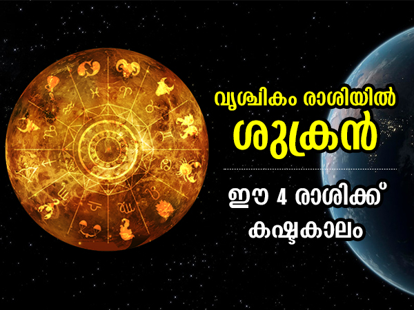നവംബര് 11ന് ശുക്രന് വൃശ്ചികം രാശിയില് പ്രവേശിച്ച് ഏകദേശം 25 ദിവസം ഇവിടെ തുടരും. ഇതിനുശേഷം ഡിസംബര് അഞ്ചിന് ധനു രാശിയിലേക്ക് ശുക്രന് പ്രവേശിക്കും. വൃശ്ചികം രാശിയിലെ ശുക്രന്റെ സംക്രമണം കാരണം കഷ്ടതകള് നേരിടേണ്ടി വരുന്ന 4 രാശിക്കാര് ആരൊക്കെയെന്ന് നമുക്ക് നോക്കാം.