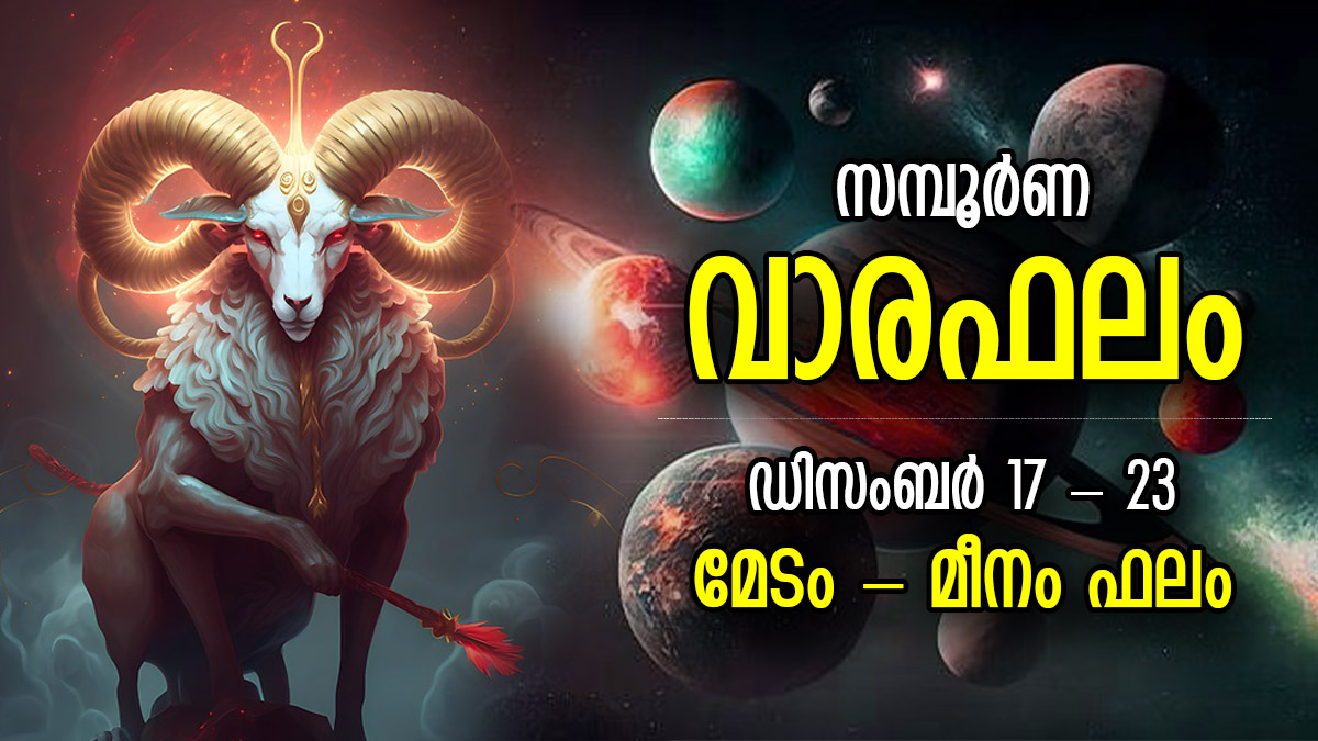 ഡിസംബര് 18 തിങ്കളാഴ്ചയാണ് സ്കന്ദ ഷഷ്ഠി വ്രതം വരുന്നത്. ഡിസംബര് 20 ബുധനാഴ്ച ദുര്ഗാഷ്ടമി വ്രതം ആചരിക്കും. ഡിസംബര് 22 വെള്ളിയാഴ്ച ഗീതാ ജയന്തിയും മോക്ഷദ ഏകാദശിയും ആചരിക്കും. ഡിസംബര് 23 ശനിയാഴ്ചയാണ് വൈകുണ്ഠ ഏകാദശി വരുന്നത്. ശുഭദിനങ്ങള് നിറഞ്ഞ ഈ ആഴ്ച 12 രാശിക്കും ജീവിതത്തില് വരുന്ന മാറ്റങ്ങള് എന്തൊക്കെ എന്ന് അറിയാന് വാരഫലം വായിക്കൂ. 2023 ഡിസംബര് 17 മുതല് 23 വരെ 12 രാശിക്കും സമ്പൂര്ണ വാരഫലം ഇതാ.
