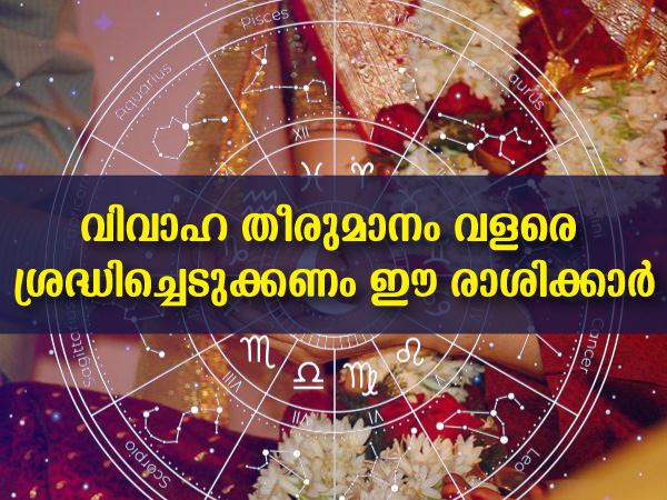 വിവാഹം എന്നത് ഓരോരുത്തര്ക്കും വളരെയധികം ഉത്തരവാദിത്വങ്ങളും കടമകളും കൂടി കൊണ്ട് വരുന്ന ഒന്നാണ്. അതുകൊണ്ട് തന്നെ വിവാഹത്തിന്റെ കാര്യത്തില് തീരുമാനം എടുക്കുന്നത് വളരെ ശ്രദ്ധിച്ച് വേണം. എന്നാല് ജ്യോതിഷ പ്രകാരം ചില രാശിക്കാര് അല്പം ശ്രദ്ധിക്കേണ്ടതായുണ്ട്. ഇവര് വിവാഹത്തിന്റെ കാര്യത്തില് അത്ര യോജിച്ച് പോവുന്നവരായിരിക്കില്ല. വിവാഹത്തിന്റെ കാര്യത്തില് നമ്മള് അതുകൊണ്ട് തന്നെ വളരെയധികം ശ്രദ്ധിച്ച് വേണം മുന്നോട്ട് പോവുന്നതിന്. അതുകൊണ്ട് തന്നെ വിവാഹശേഷം ചില രാശിക്കാരില് എന്തൊക്കെ ചെയ്താലും നിരാശയുടേയും ദേഷ്യത്തിന്റേയും ദിവസങ്ങളായിരിക്കും ഉണ്ടാവുന്നത്.