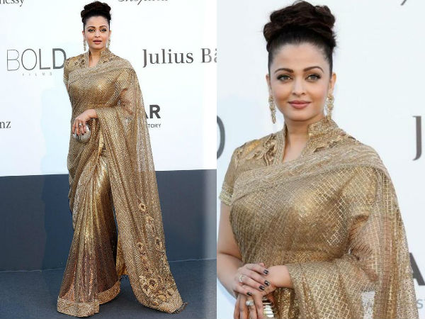കാന് ചലച്ചിത്രോത്സവത്തില് മോഡേണ് വസ്ത്രങ്ങള് ധരിച്ച് ഐശ്വര്യയെത്തിയെങ്കിലും ഗോള്ഡന് നിറത്തിലെ ഡിസൈനര് സാരി ധരിച്ചെത്തിയ ഐശ്വര്യയുടെ സൗന്ദര്യം എല്ലാവരുടേയും ശ്രദ്ധ പിടിച്ചു പറ്റിയെന്നു പറയാം.