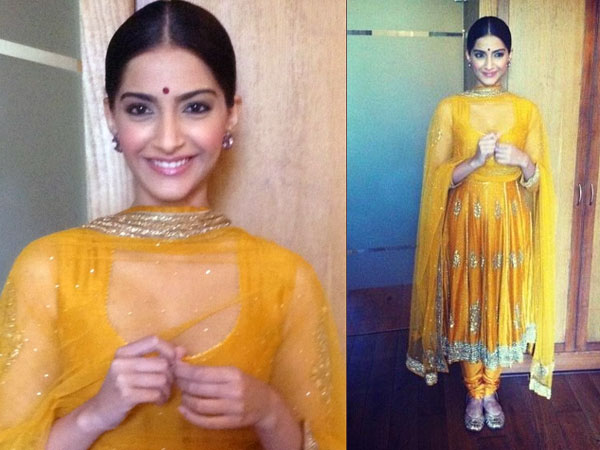 മഞ്ഞ നിറത്തിലുള്ള അനാര്ക്കലി മോഡല് ചുരിദാറില് സോനം കപൂര്. ന്യൂഡ് മേയ്ക്കപ്പും നെറ്റിയിലെ പൊട്ടും നടുവിലൂടെ വകഞ്ഞ മുടിയുമെല്ലാം തികഞ്ഞ നാടന് മട്ടു നല്കുന്നു.