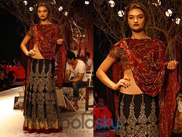 റെഡ് ആന്റ് ബ്ലാക് നിറത്തിലെ ലെഹംഗ ചോളി. ഗോള്ഡന് നിറത്തിലെ എംബ്രോയ്ഡറി വസ്ത്രങ്ങള്ക്കു ഭംഗി നല്കുന്നു.