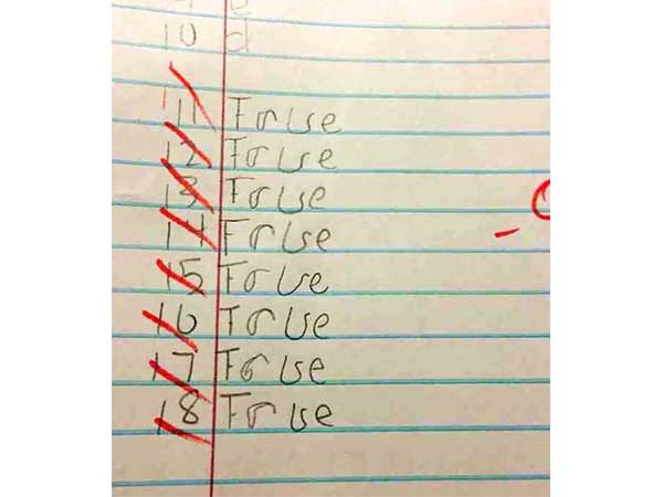 ട്രൂ ആണോ ഫോള്സ് ആണോ, ഉത്തരം കണ്ടുപിടിയ്ക്കാന് അല്പം ബു്ദ്ധിമുട്ടേണ്ടി വരും. ബുദ്ധിമാനാണ് ഉത്തരമെഴുതിയിരിയ്ക്കുന്നത്.