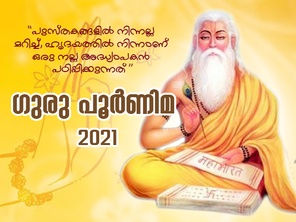 മഹാഭാരതം എഴുതിയ വേദവ്യാസന് ഈ ദിവസമാണ് ജനിച്ചതെന്ന് വിശ്വസിക്കുന്നു. അതിനാല്, ഗുരു പൂര്ണിമയെ വ്യാസ പൂര്ണിമ എന്നും വിളിക്കുന്നു. ഈ ദിവസമാണ് ഉത്തര്പ്രദേശിലെ സാരാനാഥില് ഗൗതമ ബുദ്ധന് തന്റെ ആദ്യത്തെ പ്രസംഗം നടത്തിയതെന്നും വിശ്വസിക്കപ്പെടുന്നു. ഗുരു പൂര്ണിമയുടെ കൂടുതല് വിശേഷങ്ങള് അറിയാന് ലേഖനം വായിക്കൂ.