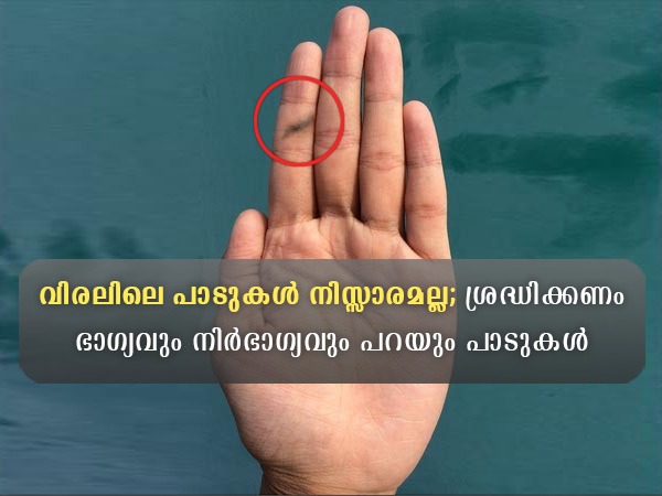 ഹസ്തരേഖാ ശാസ്ത്രത്തിന് നമുക്കിടയില് വളരെയധികം പ്രാധാന്യമാണ് ഉള്ളത്. എന്നാല് മുഖം വായിക്കുന്നത് പോലെ തന്നെ പ്രധാനപ്പെട്ടതാണ് ഹസ്ത രേഖാശാസ്ത്രം. ലക്ഷണശാസ്ത്രം അനുസരിച്ച് നിങ്ങളില് ഉണ്ടാവുന്ന ചില പാടുകള് അല്പം പ്രാധാന്യമുള്ളതാണ്. മുഖം വായിച്ച് ലക്ഷണം പറയുന്നത് പോലെ തന്നെ പ്രധാനപ്പെട്ടതാണ് ഹസ്തരേഖാശാസ്ത്രവും. വിരലുകളില് പാടുകള് ഉണ്ടെന്നതിന്റെ അര്ത്ഥമെന്താണ്? ജ്യോതിഷത്തിന്റെ ഒരു ഘടകമെന്ന നിലയില്, ഇത്തരം പാടുകള് ശുഭകരമോ അശുഭകരമോ ആകാം.
