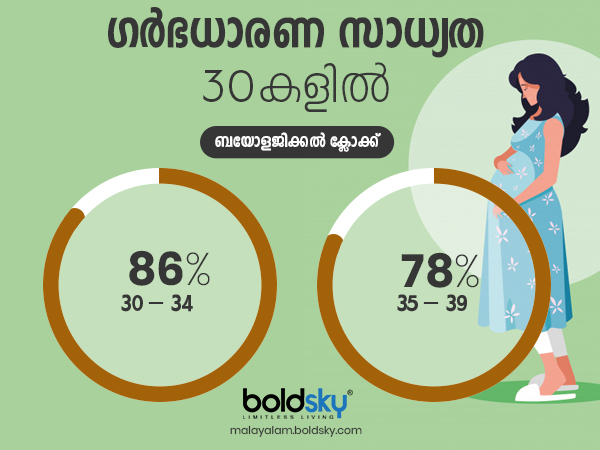 ബയോളജിക്കല് ക്ലോക്ക് എന്നതിനെ അടിസ്ഥാനമാക്കി 30കള്ക്കു ശേഷം സ്ത്രീകളിലെ ഗര്ഭധാരണ സാധ്യത കുറയുന്നുവെന്നു തന്നെ വേണം, പറയുവാന്. എന്നിരുന്നാലും 30നു ശേഷം, അതായത് 30-34 വരെയുള്ള പ്രായത്തിലെ ഗര്ഭധാരണ സാധ്യത 86 ശതമാനം വരെയുണ്ട്. ഇതുപോലെ ഈ പ്രായത്തിലെ അബോര്ഷന് സാധ്യത 20 ശതമാനവുമാണ്. 35-39 വരെയുള്ള പ്രായത്തിലെ ഗര്ഭധാരണ സാധ്യത 78 ശതമാനം വരെയാണ്. പ്രത്യേകിച്ചും 37നു താഴെയെങ്കില്. അതേ സമയം അബോര്ഷന്, കുട്ടിയ്ക്കുണ്ടാകുന്ന ഡൗണ് സിന്ഡ്രോം, അസാധാരണമായ ഗര്ഭധാരണ പ്രശ്നങ്ങള് എന്നിവ വര്ദ്ധിയ്ക്കുകയും ചെയ്യുന്നു.