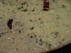 തേങ്ങാ ചിരകിയതില് പച്ചമുളക്, ജീരകം എന്നിവ ചേര്ത്ത് അരച്ചെടുക്കുക. തൈര് പതഞ്ഞുവരുമ്പോള് അരച്ച തേങ്ങാ മിശ്രിതം കറിയിലേക്കു ചേര്ക്കണം. ഇത് ഒരുവിധം തിളപ്പാകുമ്പോള് വാങ്ങി വയ്ക്കുക.