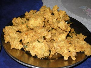 പച്ചമുളക് അരിഞ്ഞ് കടലമാവില് ഇടുക. എണ്ണയൊഴികെയുള്ള മറ്റെല്ലാ മസാലകളും ചേര്ക്കുക. ആവശ്യത്തിന് വെള്ളം ചേര്ത്ത് ഇത് കുഴമ്പു രൂപത്തിലാക്കുക. മല്ലിയില ചെറുതായി അരിഞ്ഞിട്ട് ഇളക്കണം.