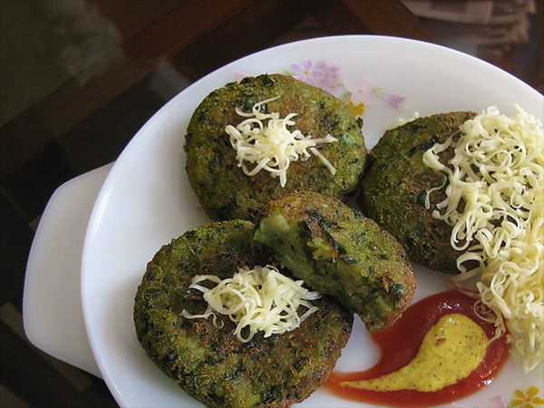 ഉരുളക്കിഴങ്ങ പുഴുങ്ങി തോലി കളഞ്ഞെടുക്കുക. ഇത് നല്ലപോലെ ഉടയ്ക്കണം. ഗ്രീന്പീസും വേവിച്ചുടയ്ക്കുക. ചീര നല്ലപോലെ കഴുകി ചെറുതായി അരിഞ്ഞെടുക്കണം. സവാള ചെറുതായി അരിയുക. ഇവയെല്ലാം കൂടി നല്ലപോലെ കൂട്ടിച്ചേര്ക്കുക. ഇതിലേക്ക്് മല്ലിയില, ഉപ്പ്, പച്ചമുളക്, മഞ്ഞള്പ്പൊടി, ചാട്ട് മസാല, കോണ്ഫ്ളോര് എന്നിവ ചേര്ത്തിളക്കുക.