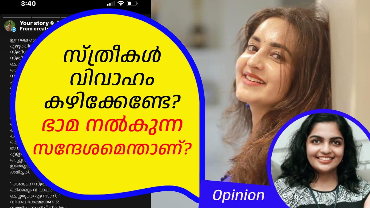 ഈ ചോദ്യം പൊതുചര്ച്ചയ്ക്ക് വെക്കേണ്ടി വരുന്നതാണ് സ്ത്രീകളെ സംബന്ധിച്ച് ഏറ്റവും വലിയ പരാജയം. രണ്ട് വ്യക്തികള് ചേര്ന്ന് ഒന്നിച്ചൊരു ജീവിതം തുടങ്ങുന്നതിന്റെ ഔദ്യോഗിക കരാര് ആണ് വിവാഹം. അത് അവരവര് ഇഷ്ടമുള്ളപ്പോള്, ഇഷ്ടമുള്ളവരുടെ കൂടെ നടപ്പിലാക്കേണ്ടതാണ്. 'സ്ത്രീകള് വിവാഹം കഴിക്കണോ' എന്ന വിഷയം ഏറ്റവും കൂടുതല് ചര്ച്ച ചെയ്യുന്നതും, നടി ഭാമയുടെ സ്റ്റോറിയില് ഏറ്റവും കൂടുതല് പ്രതികരിക്കുന്നതും പുരുഷന്മാരാണ്. ഈ വിഷയത്തില് ഉള്ള കമന്റ് ബോക്സ് നോക്കിയാല് സ്വന്തം വിവാഹം സ്വയം തീരുമാനിച്ച് നടത്താന് ഈ സമൂഹത്തില് സ്ത്രീകള്ക്ക് എത്രത്തോളം സ്വാതന്ത്ര്യമുണ്ട് എന്ന് മനസ്സിലാകും.